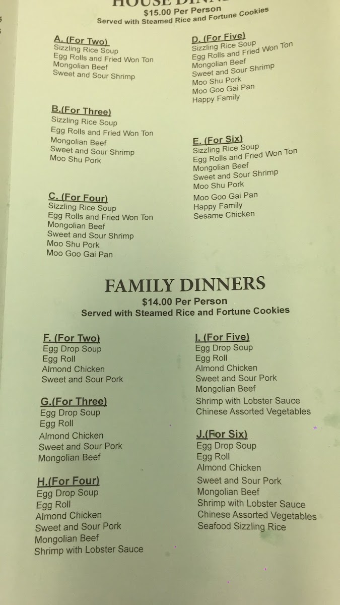 For those who enjoy a bit of variety, Ming’s offers House Dinner and Family Dinner sets that can accommodate two to six people, priced at $15 and $14 per person, respectively. Each set includes a variety of appetizers, such as Sizzling Rice Soup, Egg Rolls, and Fried Wonton, along with signature dishes like Mongolian Beef, Sweet and Sour Shrimp, and Moo Shu Pork, all served with steamed rice and fortune cookies.